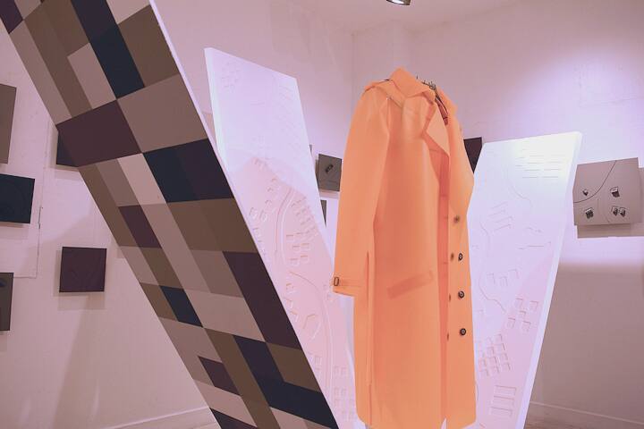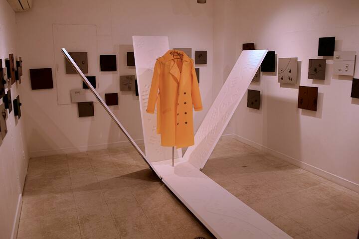 中央の黄色系トレンチコート。デザインはごく一般的なもの。所々が破れた金属籠状のトルソに被せる形で宙に浮く。 |
