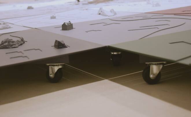 床ユニットは都市迷彩色で塗られ、底面の自在キャスターで配置換えができるようになっている。 配された模型はゲーム盤の複製パーツである。 |