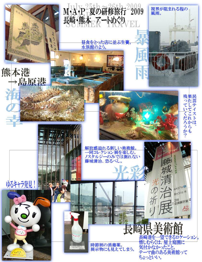 今年は長崎のアートスポットを巡る旅。有田・伊万里も予定していたのですが、生憎の暴風雨に九州北部は被害のニュースが続出。急遽熊本市を見学ポイントに入れ、途中を大幅カットすることになりました。マイクロバスに揺られながらの9名の旅です。 どこを見てもどんより続く空・鈍い色彩。それならまだしも、車の外に出られないような豪雨も。カメラを抱えながらも、なにかすっきりとしない道中でしたが、そこはやっぱりこのメンバー。ゆるいボケツッコミをちりばめた、楽しい時間となりました。 念願の長崎県美術館の展示ならびに充実したミュージアムショップ、熊本市現代美術館のスケールの大きな作品を堪能するという、九州でも新しく大きなメジャースポットを押さえた2日間。いつかは行くべき旅をした、という満足感は得ましたが、心はもう次回への期待でいっぱいです。