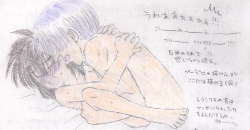 月影さんにいただいた、なにやらすごいトラ天! すごいっす、ハードっす!これぞ18禁って感じっす! 悟天の顔が〜〜!!! トランクス、おめえそれ合意の上か?え?(笑) いやぁ・・・負けました・・・月影さんってば若い身空で・・・いやん(爆) なにやらこれからもいろいろもらえるらしいぞぉ〜、わくわくわくわく(おい) ちなみに、これでも控えめなんだそうです!!! すげえ! その割に横に書いてあるコメントは動揺してねえか?(笑) おいらもがんばりますっ!(何を?笑) ありがとね〜★